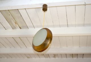 850 €Suspension Stilnovo Modèle « 1205 » Année 1960, Luminaire vintage 60′ en laiton et verre givré.